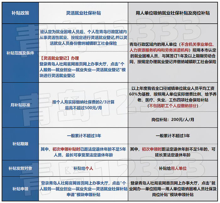 经认定后的就业困难人员在青岛行政区域内从事灵活性就业、按规定进行灵活就业登记,并以灵活就业人员身份缴纳城镇职工社会保险的,可以申领灵活就业社会保险补贴。补贴金额按照个人实际缴纳社会保险费的三分之二计算,每月最高不超过500元;补贴期限一般为3年,其中,初次申领补贴时已距法定退休年龄不足5年人员,最长可享受至法定退休年龄。