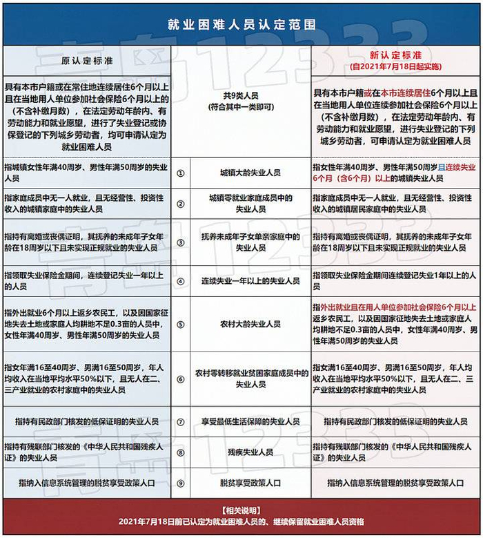 自2021年7月18日起,青岛市正式实施《关于加强就业困难人员认定管理有关问题的通知》。《通知》对于就业困难人员认定标准略有调整,进行认定的人员需具有青岛市户籍或在青岛市连续居住6个月以上,同时,明确9类群体可以申请认定就业困难人员,其中,对城镇大龄失业人员和农村大龄失业人员的认定标准也有所补充。