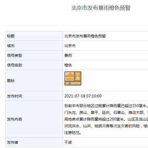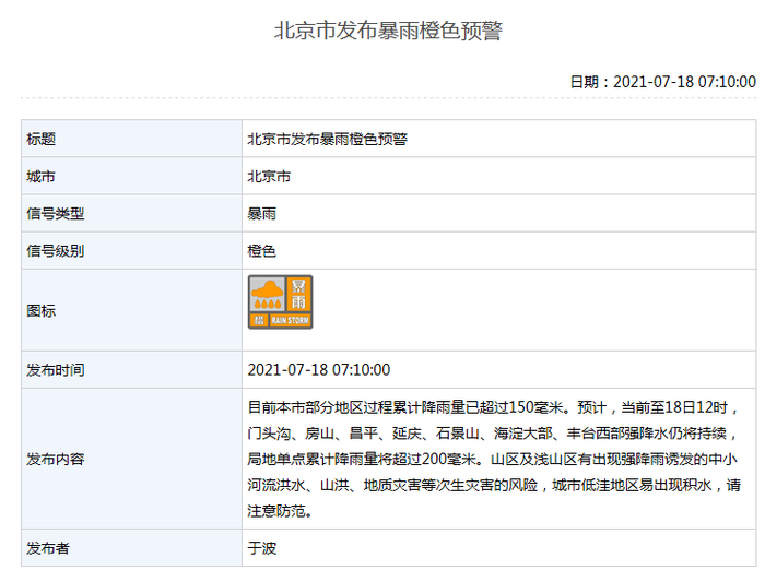 7月18日7时10分,北京市气象局升级发布暴雨橙色预警。