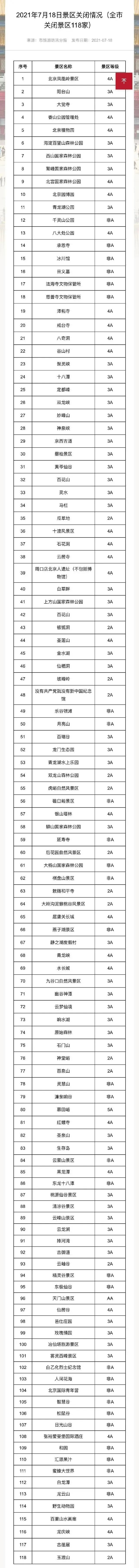 据北京旅游网官博消息,北京市文旅局提示:18日凌晨至中午本市山区普降暴雨,部分区域出现山洪和地质灾害险情,山区景区已关闭,请广大市民游客避免前往山区景区、河道等危险地带游玩。7月18日北京市景区关闭名单如下:↓↓↓