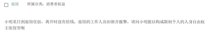 一个朋友某日到旅馆住宿,离开时没有给钱,旅馆的工作人员扣留了他并报警,请问这个朋友能以限制个人的人身自由要求旅馆负侵权责任吗?