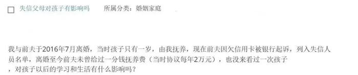 我与前夫于2016年7月离婚,当时孩子只有一岁,由我抚养,现在前夫因欠信用卡被银行起诉,并被列入失信被执行人名单,离婚至今前夫未曾给过一分钱抚养费(离婚时协议约定每年给付2万元),前夫也没来看过一次孩子,前夫被列入失信被执行人名单,对孩子以后的学习和生活有什么影响吗?