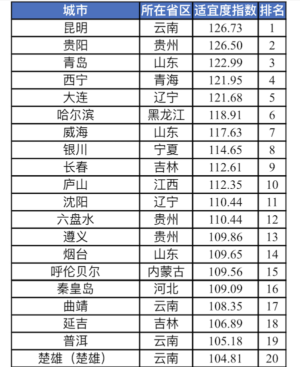 新民晚报讯(记者 易蓉)中国夏季的“清凉世界”在哪里?什么城市是夏季最适宜的候鸟式养老栖息地?昨日,上海交通大学行业研究院发布《2021中国候鸟式养老夏季栖息地适宜度指数》,为日渐盛行的候鸟式养老提供具有科学依据的城市选择参考手册。结果显示,昆明位居榜首,紧随其后分别是贵阳和青岛,第四到十名的分别是西宁、大连、哈尔滨、威海、银川、长春、庐山。