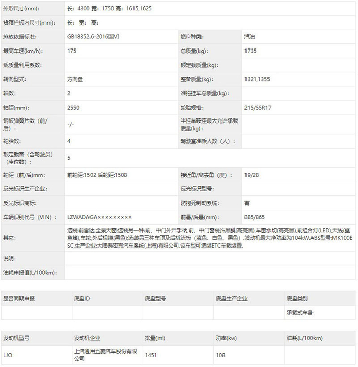 车身尺寸方面,新车的长宽高分别为4300/1750/1615(1625)mm,轴距为2550mm,整备质量为1321(1355)kg。配置方面,新车提供前雷达、全景天窗、轮毂、双色车身、LED大灯等配置选择。动力方面,新车搭载一台1.5T发动机,最大功率为108kW,最高时速可达175km/h。
