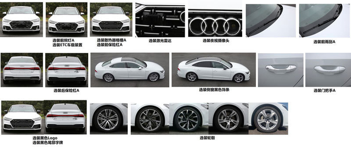 奥迪A7L亮相已经很久了,相信大家都对该车有所了解,外观方面就不过多介绍了,这次主要来看申报信息中亮点。A7L将可选装前大灯、夜视摄像头、激光雷达、侧窗黑色饰条、黑色logo及黑色尾部字牌等选项,同时有5种轮毂可选,而“天窗、前后摄像头、侧摄像头”将全系标配。