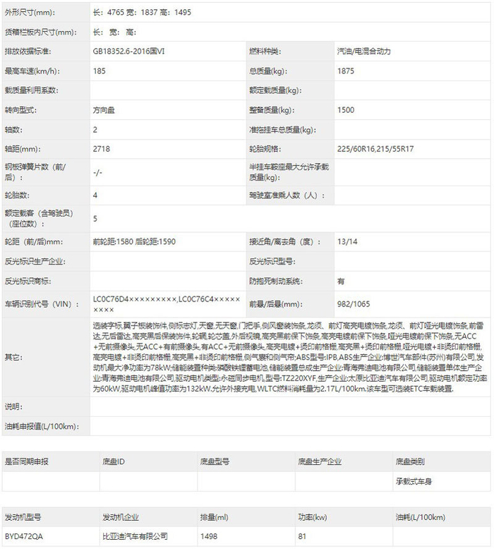 车身尺寸方面,新车的长宽高分别4765/1837/1495mm,轴距2718mm,整备质量为1500kg,轮胎拥有225/60R16、215/55R17两种规格可供选择。动力方面,新车搭载1.5L发动机,最大功率为81kW,同时匹配一台驱动电机,最大功率为132kW,WLTC油耗为2.17L/100km,最高时速可达185km/h。