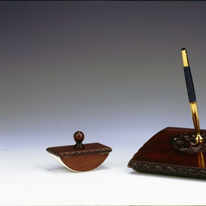 三件套中的金笔,是当年英雄金笔厂专门为中国入世打造的。这是一支18K金笔,笔身采用中国古老的点螺工艺,配以红木雕花底座,既精美又富有民族特色,既古朴典雅又庄重大气。如今它们都被收藏在中国国家博物馆中。