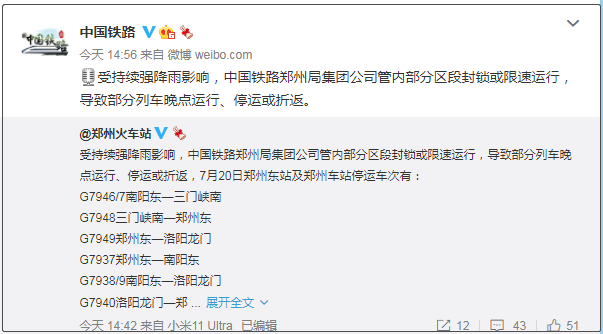 7月20日10时许,受连日强降雨影响,郑西高铁郑州西站至巩义南站间部分线路设备被雨水浸泡发生故障,导致部分高铁列车晚点运行、停运或折返。