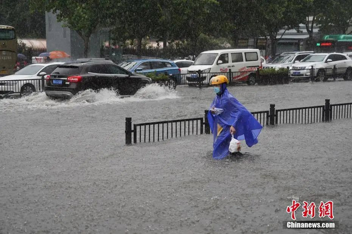 7月20日,河南郑州,一名外卖员在暴雨中送餐。中新社记者 李超庆 摄