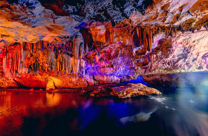 新颖独特的三种游览方式更是令人可近距离感受大自然的神奇。上游1/3乘船,中游1/3坐小火车,下游1/3步行,整个旅途轻松又愉快。洞内处处有水,水水均清,水面波光粼粼,水下暗流涌动,在灯光的照眏下色彩斑斓,倒影成趣。