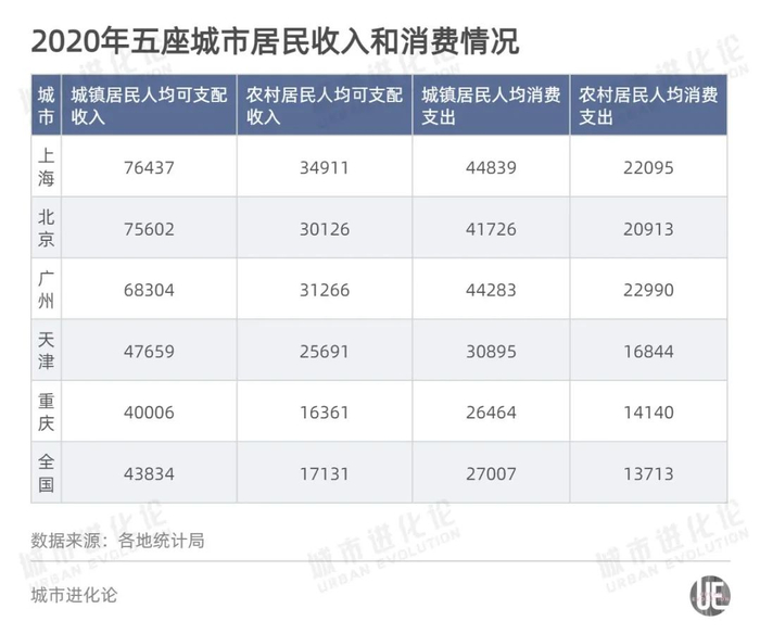 在可支配收入方面,2020年,上海、北京城镇居民人均可支配收入超过7万元,北上广农村居民人均可支配收入也超过3万元。与此同时,人均消费支出也在全国平均线之上。