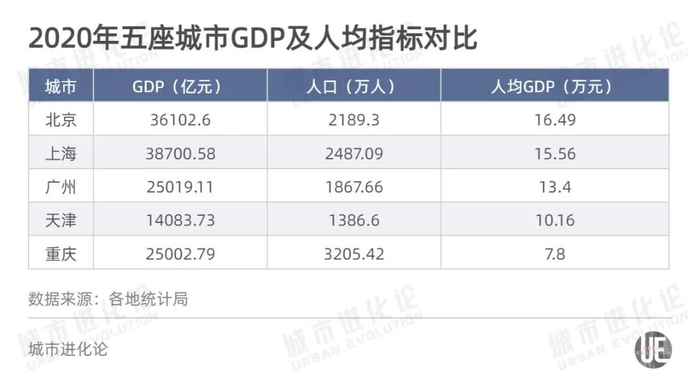 整体来看,五座城市的经济总量、人口规模,均排在全国城市前列,但在人均GDP——城市“富裕度”衡量指标上,重庆尚不足10万元。