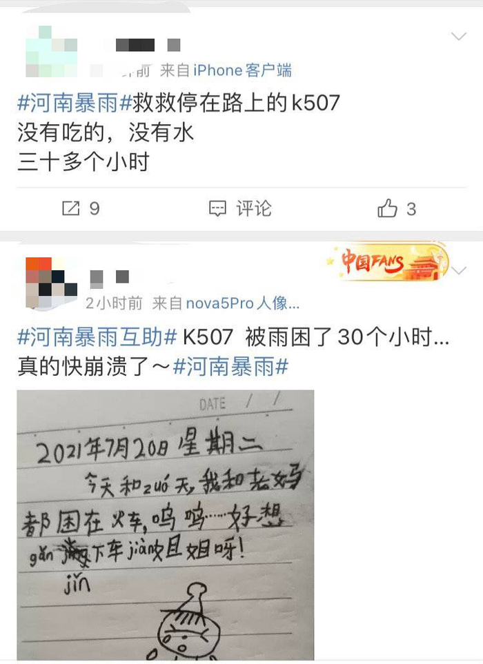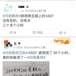 另一趟k507次列车情况类似,乘客求助称,列车停滞在郑州和洛阳之间靠近郑州的地方,已超过24小时(发博时间20日下午8点36分)车内没有足够的食物。一名车上乘客告诉封面新闻记者,目前车里没什么大问题,就是乘客饥饿和疲惫,有纯净水但没有食物,不知道什么时候能送来物资,手机快没电了,只能偶尔看消息。21日1时许,仍有乘客在微博上求助,称已被困30多个小时,没有吃的也没有水,非常着急。