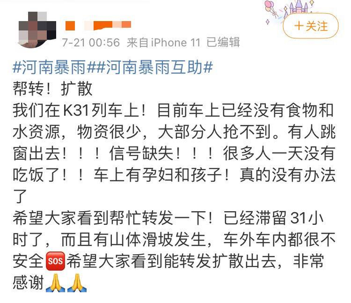 7月20日下午,多名网友在微博求助称因郑州暴雨被困在火车上,火车均滞留在郑州市周边。20日下午4时许,k31列车一乘客在微博求助称已经被困超过25小时,列车断水断电。数小时后另一同车次乘客表示,目前车上缺少食物和水,信号缺失,有人一天没有吃饭了,车上还有孕妇和孩子。