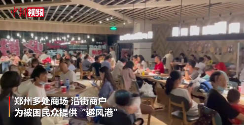 郑州多处商场、沿街商户为被困民众提供“避风港”。