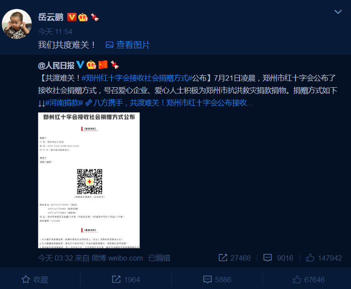 河南多地暴雨致灾,7月21日凌晨,郑州市红十字会公布了接收社会捐赠方式,号召爱心企业、爱心人士积极为郑州市抗洪救灾捐款捐物。21日中午11时54分,岳云鹏在微博转发@人民日报 关于郑州红十字会接收社会捐赠方式的微博,并发文,“我们共度(应为渡)难关”。在这条微博中,岳云鹏附了一张他为河南抗洪救灾捐出的100万元银行电子回单。
