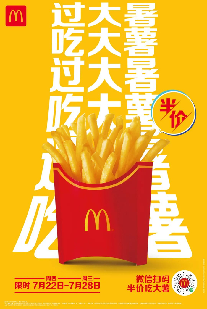 活动时间为2021年7月22日至2021年7月28日,用户扫码进入“麦当劳礼品卡”平台购买“半价大薯条”(限量10万份)及“大薯买一送一”(限量5万份)优惠卡券,在2021年7月22日至2021年8月6日内,凭券前往麦当劳餐厅柜台核销兑换(部分餐厅不参加本活动,可联系餐厅工作人员获得帮助)。