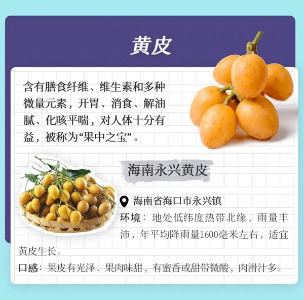 黄皮热量低,膳食纤维、维生素C也高,还富含镁、铁、锌微量元素。作为世界黄皮原产地之一,海口市永兴镇具有优越的生态环境、特殊的土质以及优良的品种,这些因素造就了永兴黄皮优异品质。