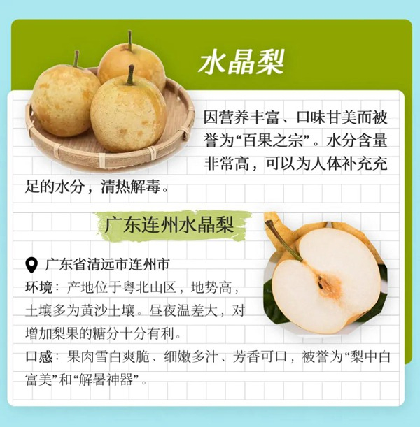 梨鲜嫩多汁、酸甜适口,所以又有“天然矿泉水”之称。其水分含量高,可以为人体补充充足的水分,且清热解毒,也可以起到很好的润肺、化痰、止咳的作用。