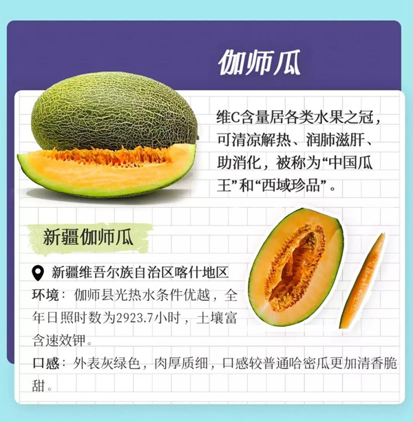 伽师瓜香甜清脆、风味独特,据悉在南北朝时期,伽师瓜就因色、香、味俱全闻名关内,被誉为“西域珍品”。