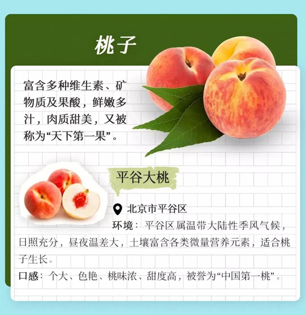 桃子果肉厚实,味道清香,含水量很高,可以止渴降暑,在夏天也是比较受欢迎的佳果。其中,北京平谷大桃,是北方水蜜桃界代表,因个大、色艳、桃味浓、甜度高、优种多而出名。