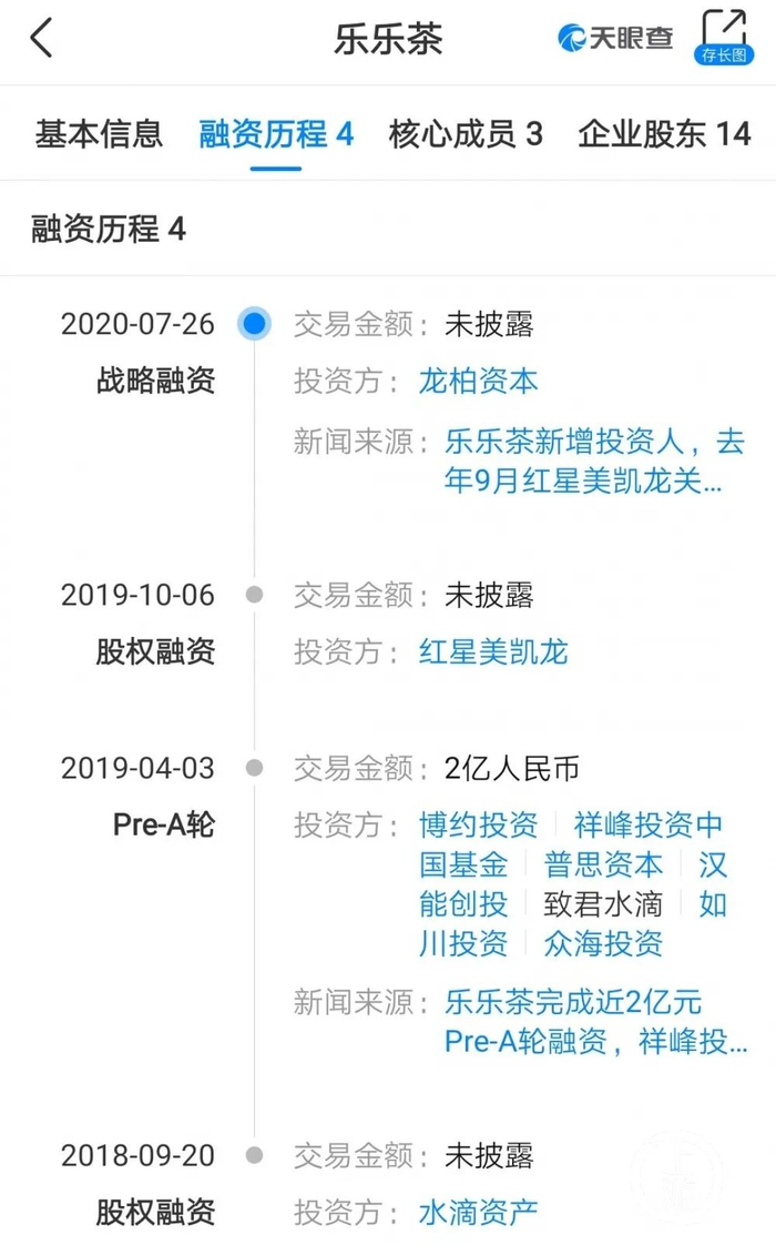 相比之下,乐乐茶在资本市场几乎没有太多水花。天眼查显示,乐乐茶累计获得过4轮融资,2019年完成pre-A轮后,有过股权和战略融资,最近一次在去年7月。其投资方包括水滴资产、博约投资、祥峰投资中国基金、普思资本、汉能创投、红星美凯龙、龙柏资本等。除了此次与喜茶同时出现热搜时出现的估值40亿元,前几轮融资并未对外公开估值。