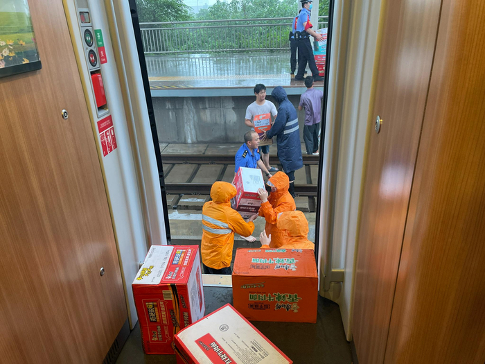 14:25分,站方为跨线路正线列车紧急供餐1300份,包括面包、方便面、火腿肠和矿泉水等食品,乘务员毕振强、杨明辉、王纪鹏身着防护服使用应急梯,冒着大雨在车下与车站人员共同搬运传递食品,并为全部旅客发放到位。