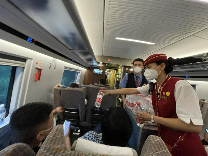 期间,由于郑州东站遭遇瞬时强降雨,列车无法进行上水和吸污作业,列车水箱除1、2、9、15、16车外,其余车厢均出现缺水的情况,列车在加强节水宣传的同时,及时为旅客发放矿泉水,使用热水壶为重点旅客送水,保障了旅客饮水供应。