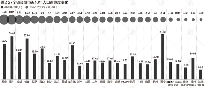 从近十年的首位度变化来看,占比提升最多的10个省会城市分别是西安、银川、成都、长春、拉萨、海口、长沙、武汉、昆明、哈尔滨,其中西安和银川提升幅度超过了8个百分点。在同口径下,十年来西安人口占全省比重提升了8.46个百分点,位居各大省会城市第一。专家分析,这些年来西安的招商引资力度很大,很多大项目来了之后,人才也随之集聚。同时,西安大力放开落户门槛,也吸引了很多人才落户。