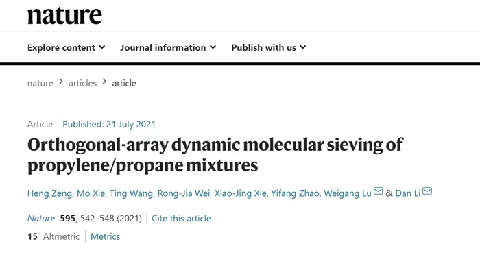 7月21日,国际顶尖学术期刊《自然》在线发表了暨南大学化学与材料学院陆伟刚教授和李丹教授研究团队的研究成果《Orthogonal-array dynamic molecular sieving of propylene/propane mixtures》,提出了一种新的分离机制——正交阵列动态筛分,实现了丙烯/丙烷分离领域的突破性进展,为设计下一代分离材料指出新方向。该研究未来可能广泛应用于石油化工、疫情防控、医疗卫生等多个领域。