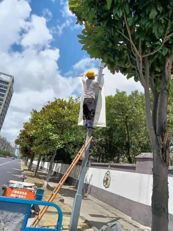 此外,一些招风旗由于背风面积较大,一旦被大风刮断刮落,极易对过往行人车辆造成伤害。昨夜今晨,嘉定新城(马陆镇)市政工作人员联合城管队员对户外各项设施进行了仔细排查,并决定将嘉定新城内一些主干道、支路两侧的招风旗全部拆除。预计今晚前,嘉定新城(马陆镇)辖区内700余杆招风旗将全部完成拆卸。