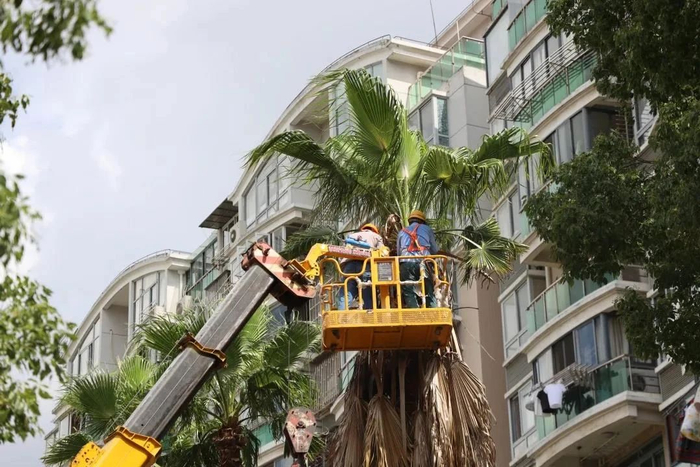 今天一早,真新街道汇丰佳苑火速开展了对小区内棕榈树的修剪、加固工作。“这些棕榈树主要作为小区内的景观树,绿色新叶与黄色枯叶搭配的景致深受居民喜爱。但如果大风将这些枯叶吹落,会对居民安全造成威胁,所以当务之急是将其全部进行修剪处理。”汇丰佳苑物业工作人员蒋磊说道,“同时,我们也会对树木进行扶正与加固,并在周围设置警示牌,保障居民的安全。”