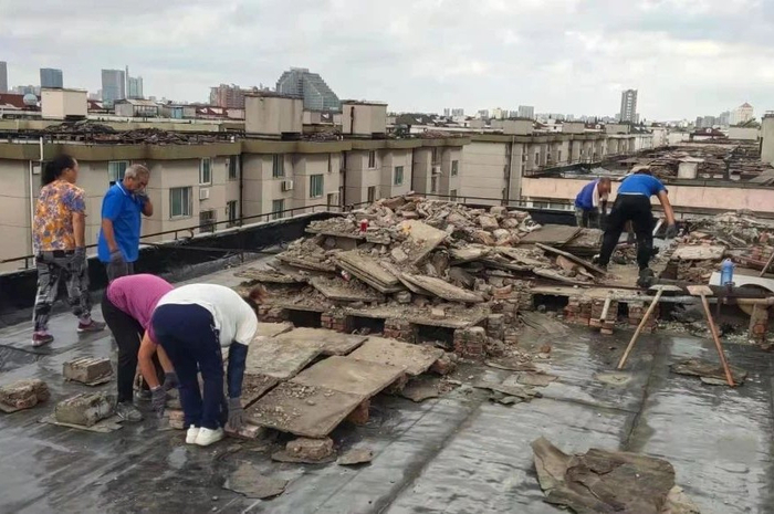 为保证居民“头顶上的安全”,新成路街道辖区物业公司还对屋顶开展了巡查,及时清理老化隔热板,疏通屋顶雨水管道。目前,万涓物业已对管辖小区的40个门牌、18个楼道2500平方米的屋顶进行了巡查和清理。