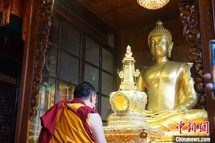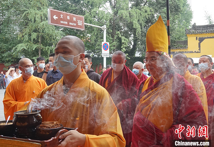 7月12日,班禅来到成都文殊院礼佛,诵《炉香赞》《心经》《回向偈》。 中新社记者 郑巧 摄