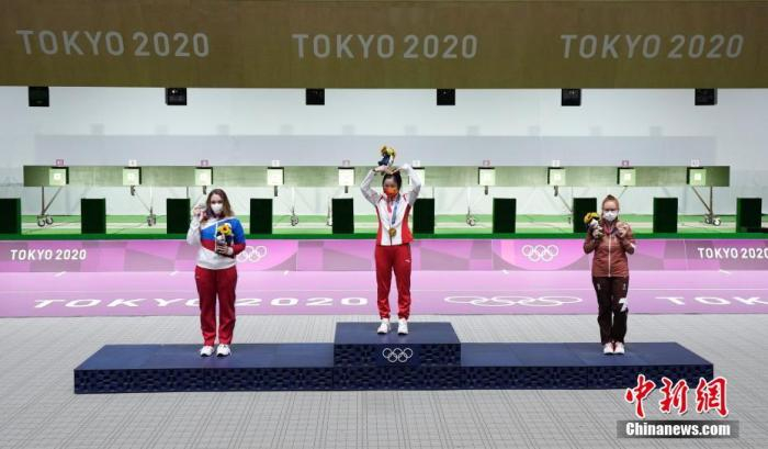 7月24日举行的东京奥运会女子10米气步枪决赛中,中国选手杨倩夺得冠军,为中国代表团揽入本届奥运会第一枚金牌。这也是本届东京奥运会诞生的首枚金牌。图为获得奖牌的选手们站在领奖台上。中新社记者 杜洋 摄