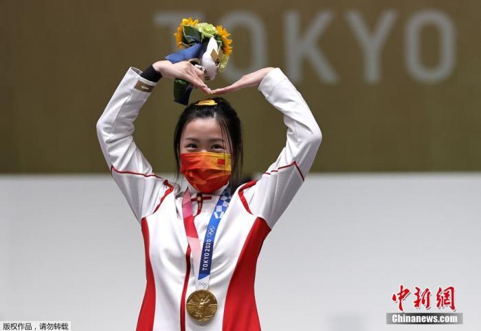 7月24日举行的东京奥运会女子10米气步枪决赛中,中国选手杨倩夺得冠军,为中国代表团揽入本届奥运会第一枚金牌。这也是本届东京奥运会诞生的首枚金牌。图为杨倩在领奖台上比出爱心手势。