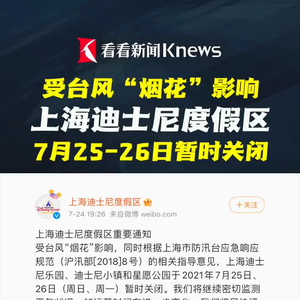 上海迪士尼度假区发布公告称,受台风“烟花”影响,同时根据上海市防汛台应急响应规范的相关指导意见,上海迪士尼乐园、迪士尼小镇和星愿公园于2021年7月25日、26日(周日、周一)暂时关闭。度假区将继续密切监测天气状况,如运营时间有进一步变化,我们将尽快通知游客。
