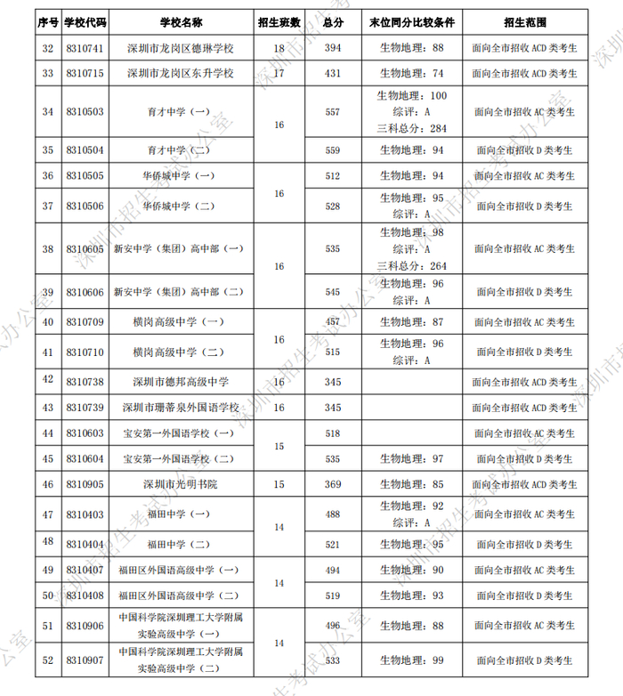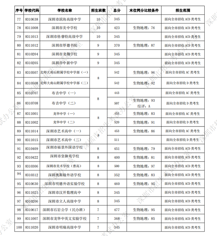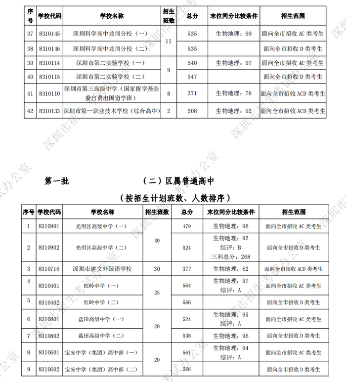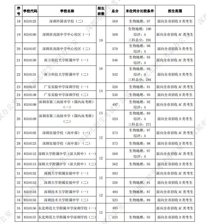 深圳市2021年高中阶段学校招生第一批划线工作顺利完成。今年各高中阶段学校(含普高、职高、技工学校)的最低录取标准(分数线)根据各学校的招生计划、考生所报志愿顺序、六科原始总分、单科等级、初二生物与地理学业水平考试成绩和综合表现评价等级等条件划定。