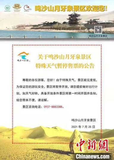当日,鸣沙山月牙泉景区官方微信公众号发布《关于鸣沙山月牙泉景区特殊天气暂停售票的公告》称,由于特殊天气,景区能见度低,为保证游客游玩安全,景区暂停开放,“如天气好转,具备开放条件,景区第一时间开园并告知”。