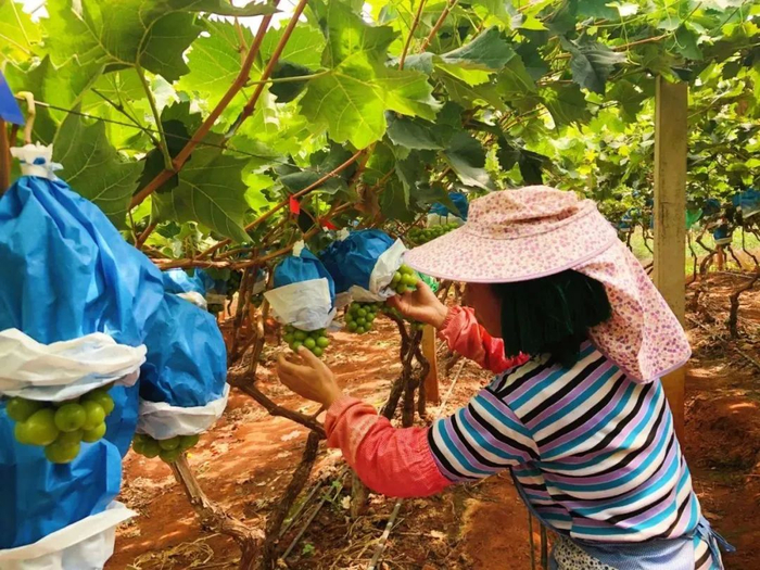 精准控温大棚,采用低密度种植,大量修建枝叶花果,让葡萄充分的享受阳光,沉淀更多的果汁!