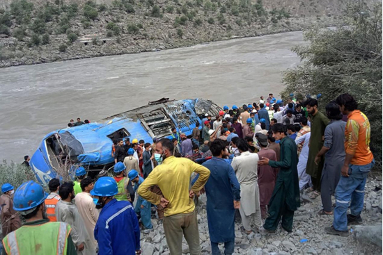 (图说:7月14日,中企通勤车爆炸后坠落峡谷。图/AFP)