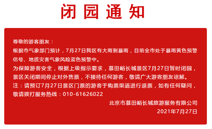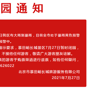 受天气影响,慕田峪长城景区7月27日暂时闭园 新京报 新京报官方账号 2021.07.2708:14 关注 原标题:受天气影响,慕田峪长城景区7月27日暂时闭园 新京报快讯 据慕田峪长城景区官微消息,慕田峪长城景区发布临时闭园通知。