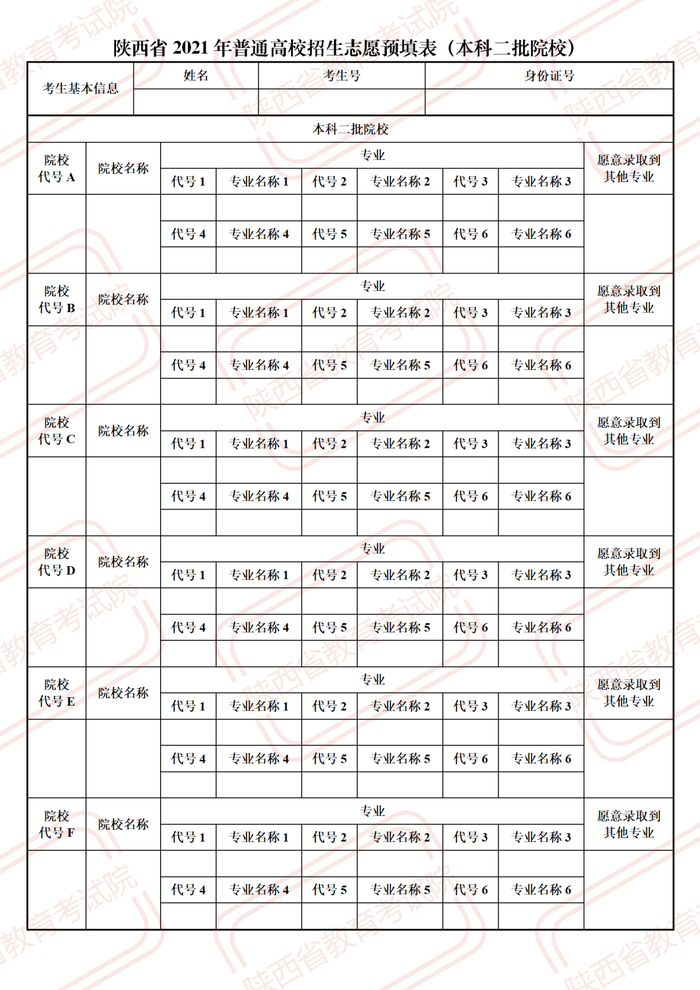 本科二批实行平行志愿投档录取模式,设置12个院校志愿,排列顺序为A、B、C、D、E、F、G、H、I、J、K、L,每所高校设6个专业志愿,设“愿录取到其他专业”的调剂表态栏。