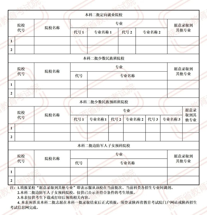 7月27日8:00至7月29日8:00,达到本科二批最低录取控制分数线及有关特殊类型招生执行的最低控制分数线,且尚未被录取的考生,可登录陕西省教育考试院门户网站(网址:https://www.sneea.cn)或陕西招生考试信息网(网址:https://www.sneac.com),填报本科二批和本科二批高水平运动队、定向就业、少数民族班、少数民族预科班和边防军人子女预科班志愿。