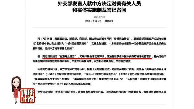 7月23 日,中方根据《反外国制裁法》对前美商务部长罗斯等7个美方人员和实体实施制裁,原因是,美方炮制所谓的“香港商业警告”,非法制裁中国中央政府驻港机构官员。这是6月初,反制裁法出台以来,中国首次动用该法案,有力反击美国一言不合就制裁的“臭毛病”。