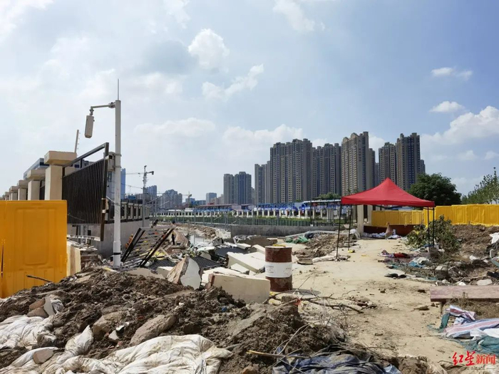 红星新闻在现场发现,西面这条未建设完成的公路与五龙口停车场之间没有建围墙,只有一排临时的蓝色铁皮围挡。在西南角,有几块围挡倒在地上,穿过围挡可以看到被洪水冲刷过的一个大豁口。