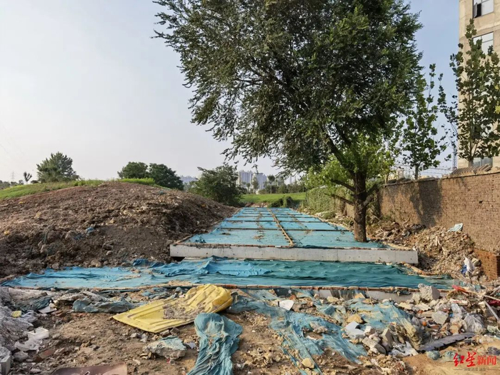 7月24日,红星新闻在现场看到,这条长约50米的五龙口明沟被一块块长方形的钢筋混凝土水泥板盖住,盖板上还铺了一层绿色的防尘布。五龙口明沟的位置是沿河绿化工程的起点,往前垒起来的土坡被铁丝网拦着,里面种植着绿植,往后是一堵墙。总体来看,这个挡板覆盖的通道虽然高出公路,但却仍是整个河边地势最低的地方。