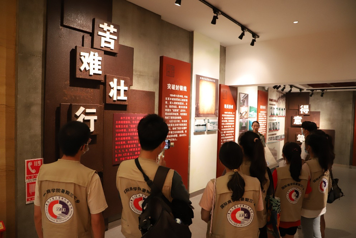 随后,社会实践团队前往太平古镇红军长征四渡赤水博物馆,进一步了解四渡赤水的感人故事,学习四渡赤水的革命精神。在中国民兵讲解员的带领下,团队首先来到博物馆大厅,对照着地理分布图对四渡赤水的地理局势与当时的路线进行了初步了解。紧接着,团队跟随讲解员的脚步进入展馆了解学习。成员们驻足观看各类红色文物与文字资料,伴随着讲解员对这段历史的细致讲解,对四渡赤水的过程有了更加深刻的认识。其中一名团队成员感概到:“今天我们拥有丰富的物质生活,良好的生活环境,美丽的大好河山,这一切在当时简直是难以触及的梦想,如今我们生活中遇到的困难与红军历经的千难险阻相比简直微不足道。作为当代有理想、有担当的青年,我们更应当继承先辈的遗志,并将四渡赤水精神发扬光大!”