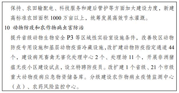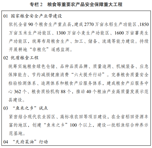 《规划》指出,要稳步提高我省粮食产量,布局发展一批现代粮油园区,建设国家优质粮油保障基地;实施优质粮油基地提升工程,开展优质粮食工程“天府菜油”行动、建设一批“鱼米之乡”。此外,要加快生猪产业转型升级,落实生猪生产扶持政策举措,高标准推进生猪标准化规模养殖,加快推动国家优质商品猪战略保障基地建设;提升优质饲料保障能力。