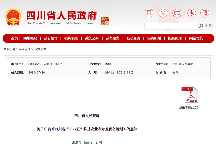 日前,省政府发布了《关于印发的通知》(以下简称《规划》)。《规划》全篇共分十二章、五十八节,对“十四五”时期我省推进农业农村现代化的总体要求、重点任务和政策措施作出了具体部署,是“十四五”时期四川省推进农业农村现代化的指导性文件。
